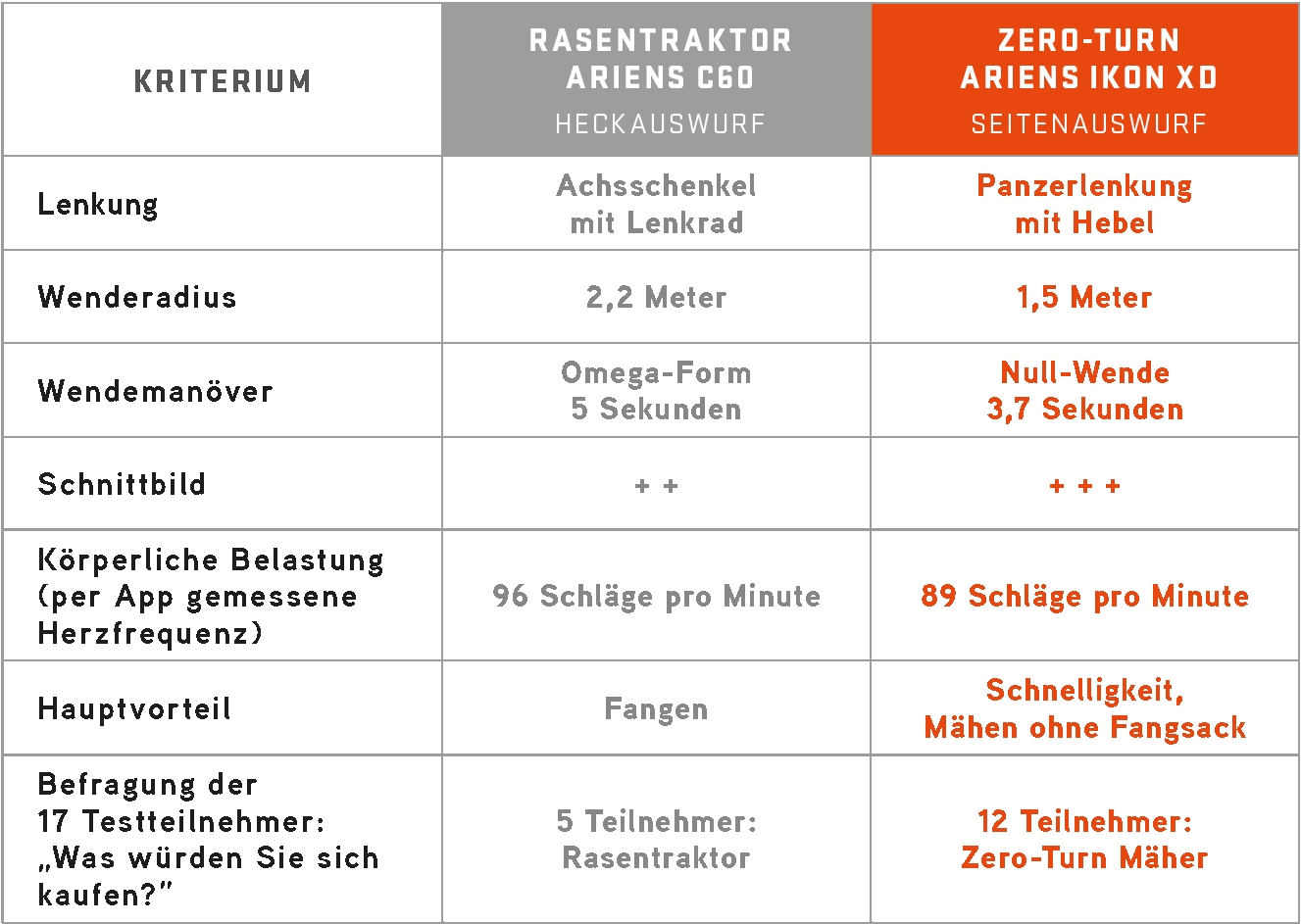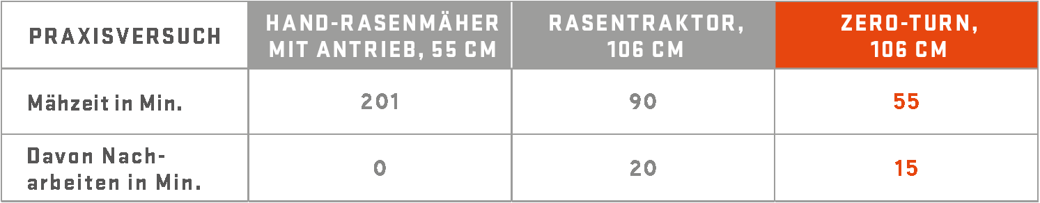 Ein Praxis-Vergleichstest zwischen einem konventionellen Rasentraktor, 106 cm, und einem Zero-Turn Mäher, 106 cm, ergab Folgendes: