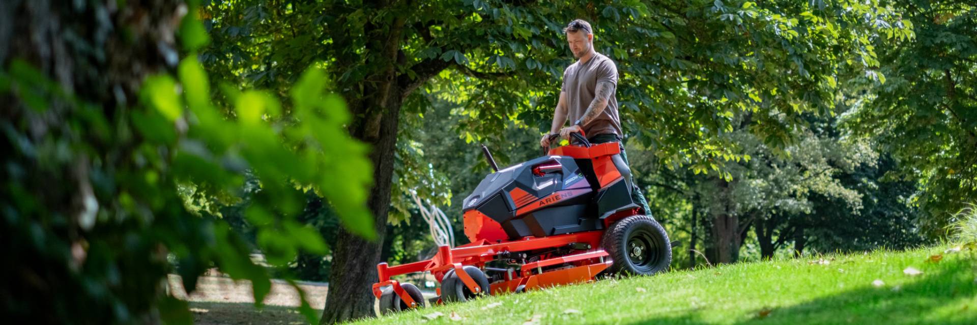 The new ARROW E is a professional battery-powered «stand-on» zero-turn mower for everyday use. Its electrical components are identical to the ZENITH E. As a stand-on mower, however, it is more compact, clearer and even more maneuverable. An ergonomic and comfortable working position is easy on the driver.