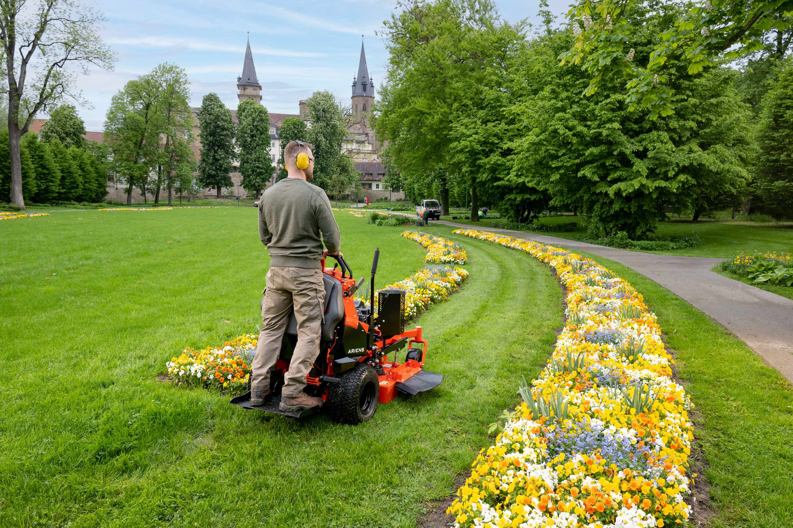 Stand-on mowers are comfortable and fast, but particularly compact, agile and spacesaving. Your back and muscles will thank you for the upright working position.
